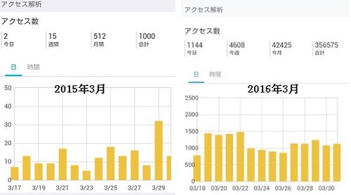 昨年の今頃、祝1000PV達成!!(^o^)!!と言う記事を書きました。 あっ、この1000PVは、一月じゃなくて五ヶ月間の累積ですからね。 www.hana3.net 去年の今頃は全然読まれてませんでしたよ。1000PVは、今なら一日です。 左が去年、右が今年。目盛りの単位が違い…